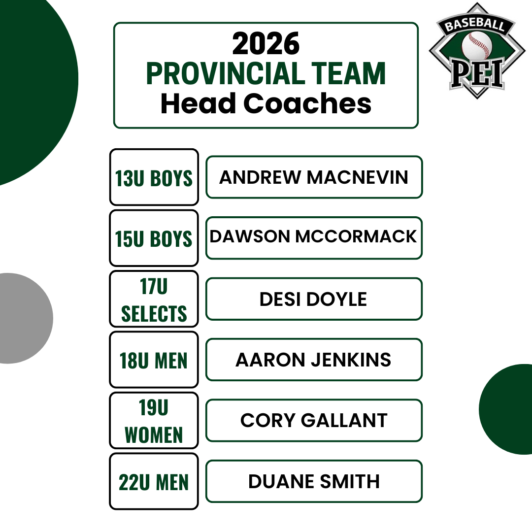 Baseball PEI is excited to announce the Provincial Team Head Coaches for the 2026 Championship Season!