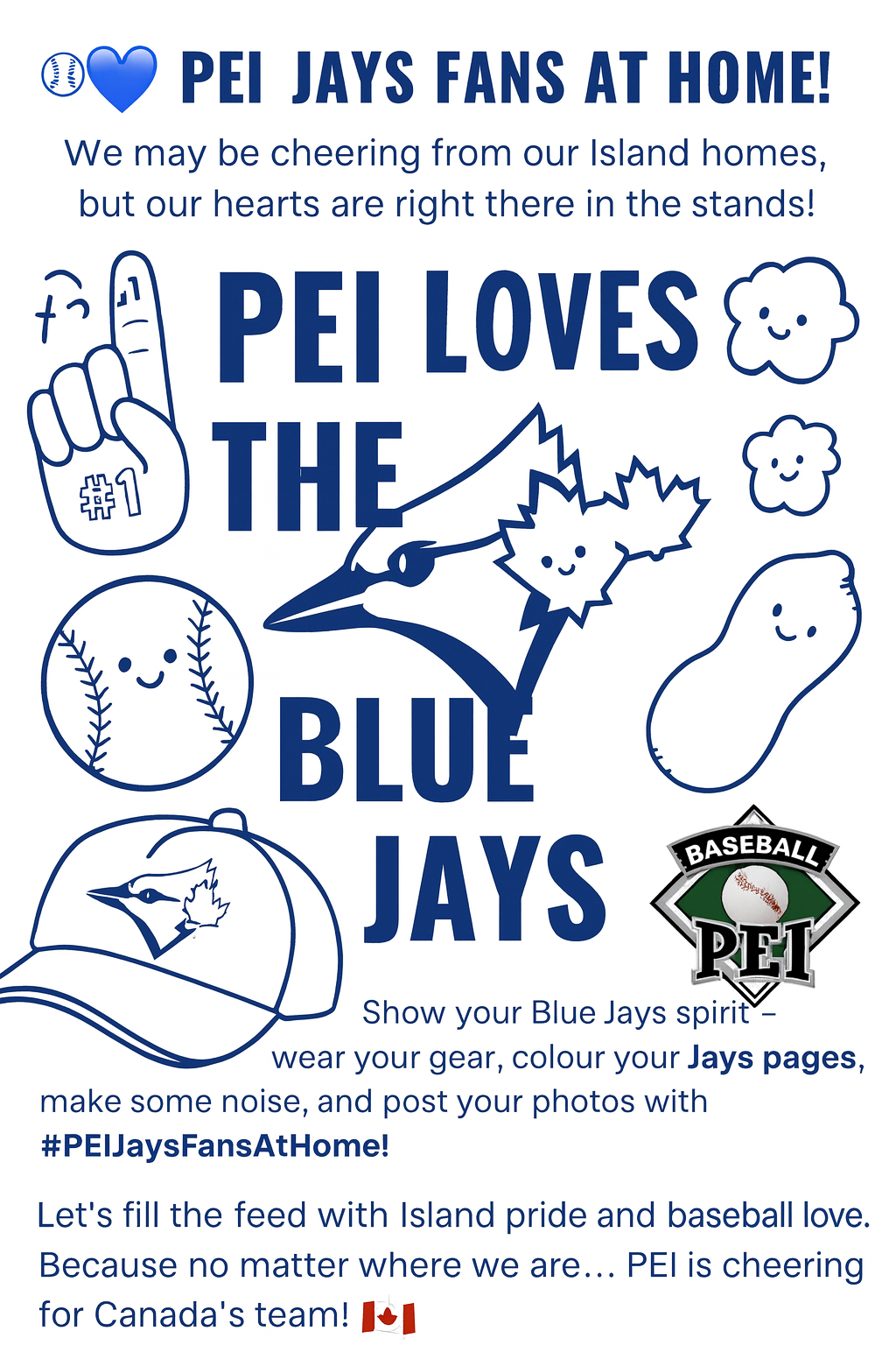 Baseball PEI wants all our baseball families to join in the excitement and show your support for the Jays. Stay tuned to our social media channels throughout the World Series as we roll out some fun ways for you to get involved from home and connect with Jays fans across the country.