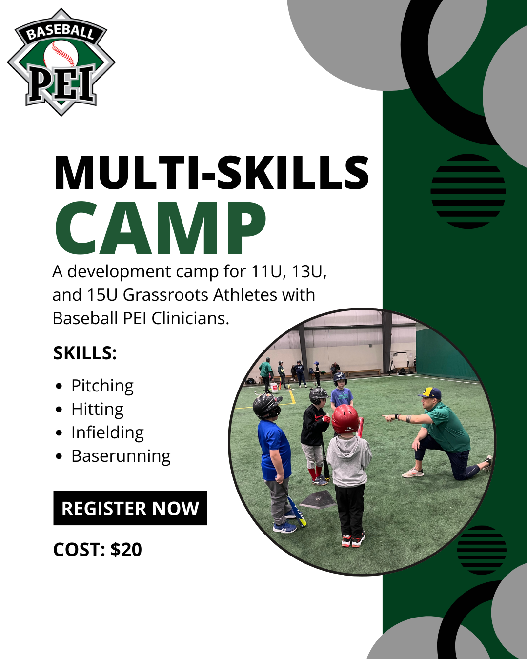 Calling 11U, 13U & 15U grassroots athletes! Join our Baseball PEI clinicians at the Summerside Dome for a high-energy development camp focused on: